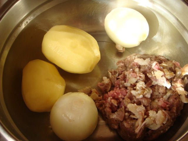 Тем временем готовим начинку: у меня была четвертинка от гуся с ногой, отделить мясо и провернуть блендером не оч.мелко, картофель и лук мелко порезать, посолить, поперчить, с солью осторожно у гуся мясо солоноватое.