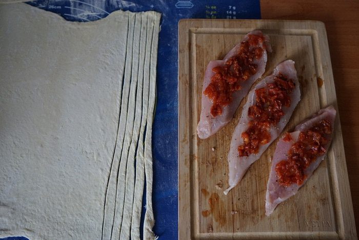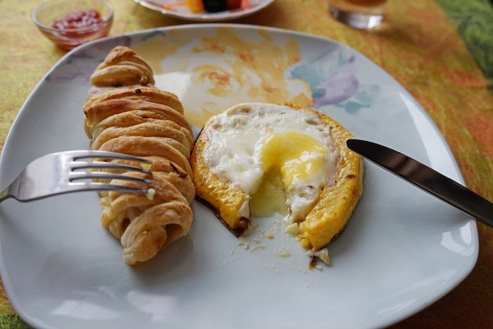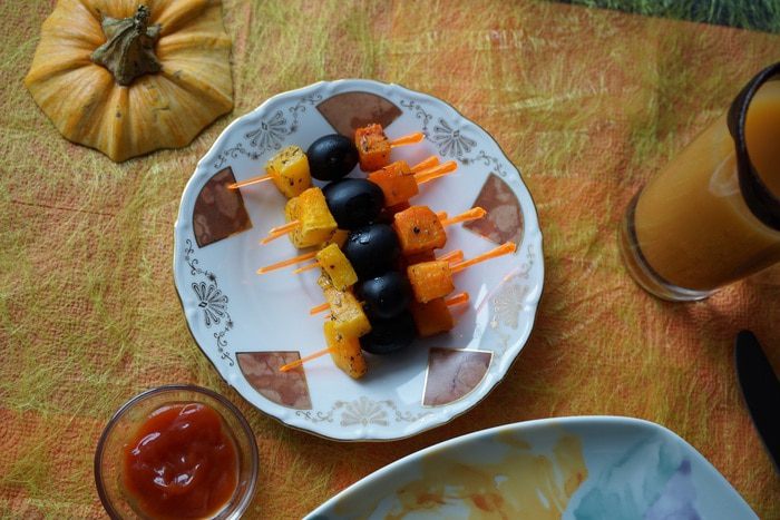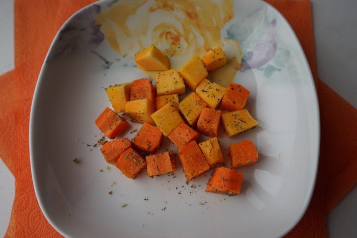 У нас есть 32 минуты на сооружение остальных составляющих нашего завтрака. Пару долек тыквы (не смогла указать в ингредиентах, что нам надо не 2 тыквы, а только 2 дольки) и морковь режем кубиками одинакового размера, немного солим и присыпаем любимыми травками. У меня это смесь итальянских трав. Выкладываем на смазанную раст. маслом фольгу в форму и отправляем в духовку к куриному филе. Мы как раз убавили температуру до 180 градусов, так что они должны приготовиться одновременно.