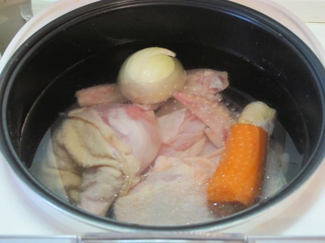 Влить 1,2 литра воды, добавить соль, черный перец горошком. Установить программу "Бульон" на 1,5 часа. Периодически снимать пену.