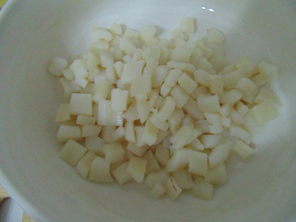 Очищенного кальмара отварить в подсоленной воде 2-3 минуты, остудить, нарезать кубиком.