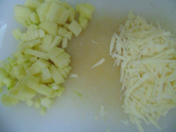 Сыр натереть на терке. Большое кислое яблоко очистить от кожуры и семечек, порезать кубиком.