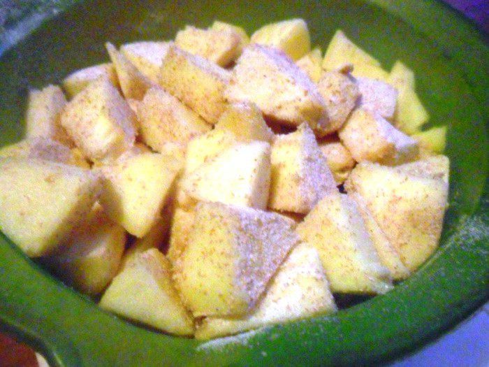 Вымытые яблоки очистиь, удалить сердцевину, нарезать кубиками со стороной 2 см. Посыпать 2 ст л муки (у меня остатки цельнозерновой) и встряхнуть, чтобы мука равномерно покрыла яблоки.