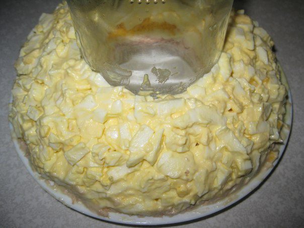 На дно выкладываем домашний майонез. Его рецепт здесь http://www.edimdoma.ru/retsepty/60508-vkusnyy-i-poleznyy-domashniy-mayonez-s-limonom