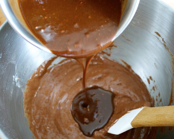 Добавить получившуюся масляно-шоколадную смесь к остальному тесту и снова осторожно перемешать.