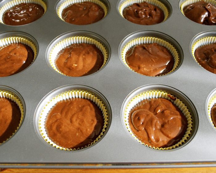 В формочки для кексов вставить бумажные стаканчики. Заполнить формочки тестом на 2/3. Поставить выпекаться капкейки в разогретую до 180°c духовку на 35 минут.