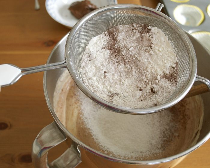 Соединить сухие ингредиенты; муку, разрыхлитель и какао-порошок... Просеять сухую смесь в миску с яичной и осторожно перемешать заворачивающими движениями, чтобы яичная масса не опустилась!