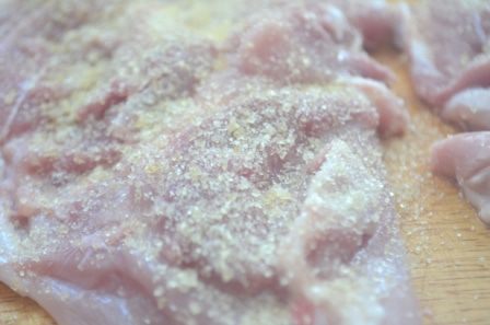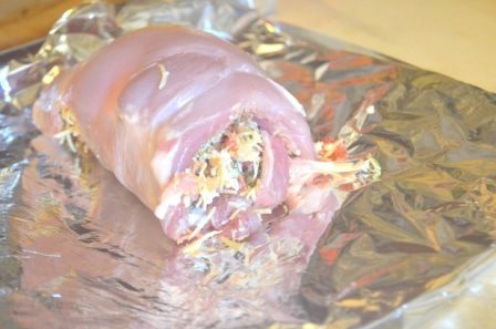 Для этого рецепта нам понадобятся очень крупные окорочка, у меня были от домашней птицы. Их надо надрезать вдоль кости и вытащить кость. Мясо раскрыть как "книгу". Посолить и поперчить