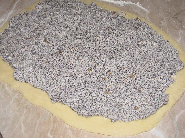 Раскатать тесто в прямоугольный пласт толщиной примерно 0,5 см и равномерно распределить маковую начинку.