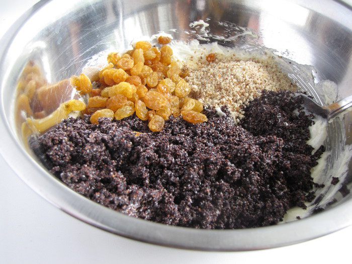 Соединить взбитое с сахаром масло, мак, белый изюм и молотый миндаль.