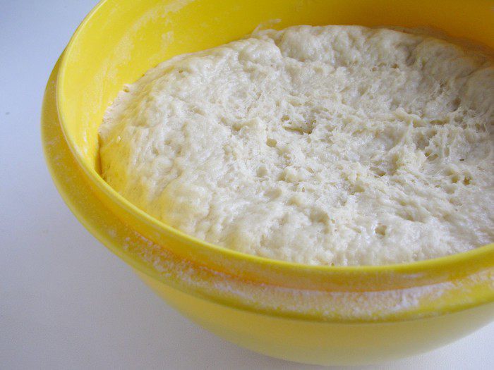Дрожжи соединить с мукой, сахаром и теплой водой. Все хорошо перемешать и оставить в теплом месте.