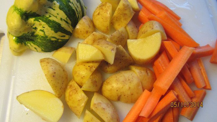 3. Картофель имеется в виду молодой, мелкий, поэтому такое количество. Если морковь будет молодая, то отлично. Если нет таковой, то и обычная отлично подойдет. То же самое и про патиссоны - в рецепте предлагают брать мини-патиссоны, если нет - то обычные.