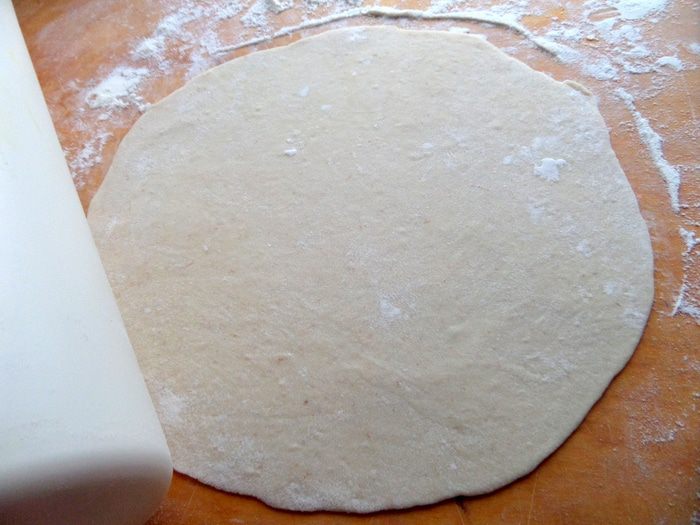 Раскатываем тонко тесто (у меня 20 см),присыпав муку на доску.