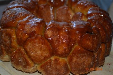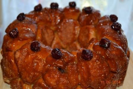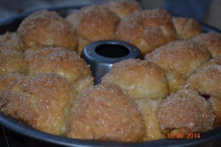 На этом этапе вы можете положить в шарик теста кусочек яблочка, вишню,изюм, шоколад или орешек. У меня вяленая вишня. Окунуть его со всех сторон в сливочное масло, а затем обвалять в сахарно-коричной смеси. Уложить в подготовленную форму.