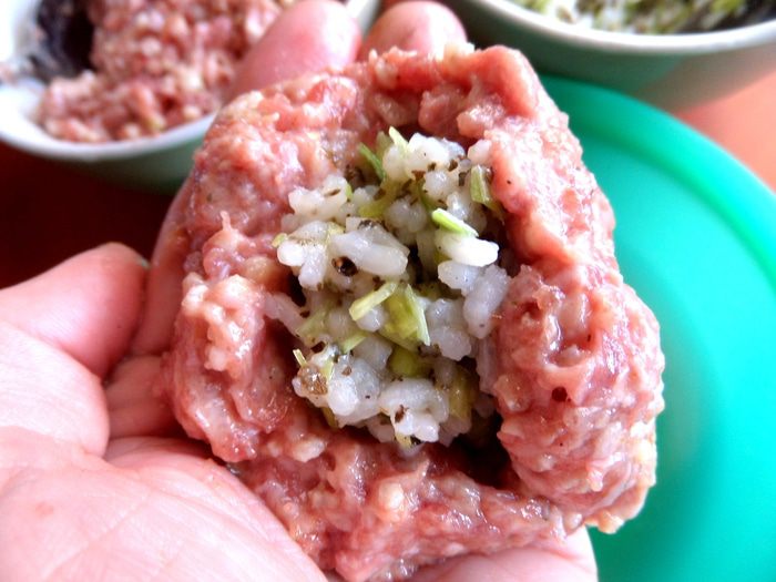 Приготовим миску с водой. Ладонь смачиваем в воде,кладём на неё ложку фарша,расплющиваем и в центр кладём немного начинки.