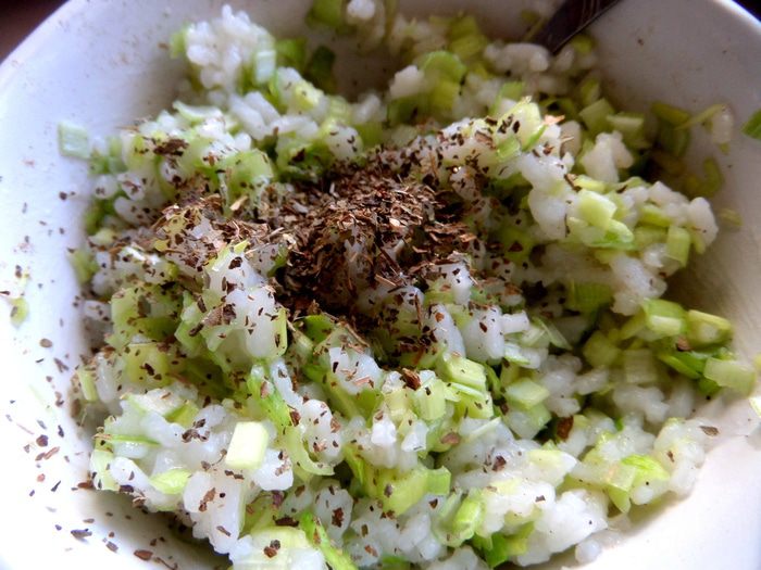 Рис тоже отварить заранее,смешать с зеленью петрушки (у меня зелень порея),посолить.