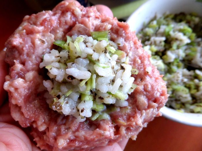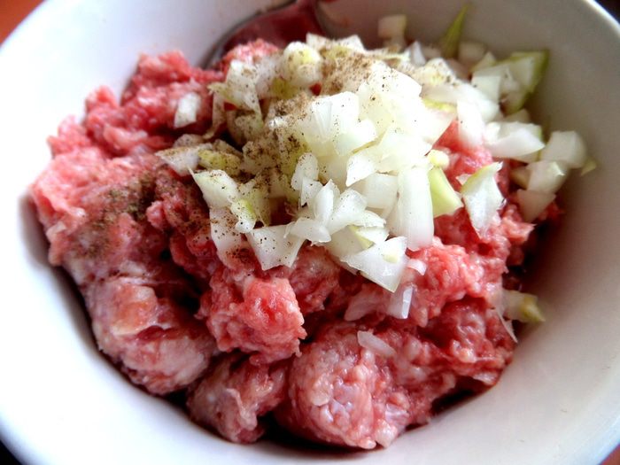По классическому рецепту нужно срезать мясо с косточки и из него перемолоть фарш. Я брала готовый фарш,добавила лук,соль,перец.