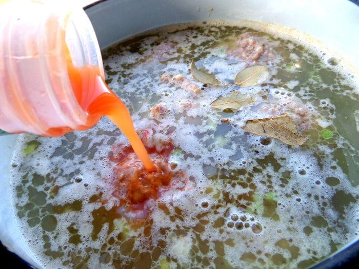 Опускаем осторожно бомбочки в горячий суп,разводим пасту в бульоне и выливаем в суп. Добавим лаврушку,пробуем на соль.