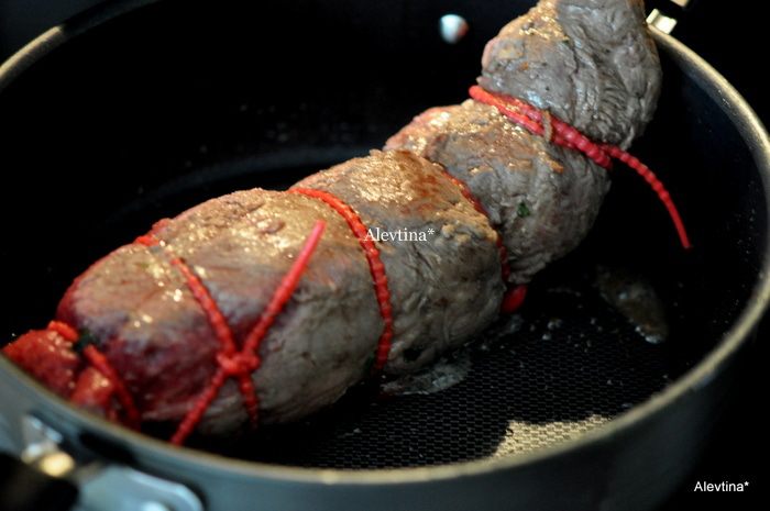 Обжариваем рулет на оливковом масле 2 стол.л. со всех сторон.