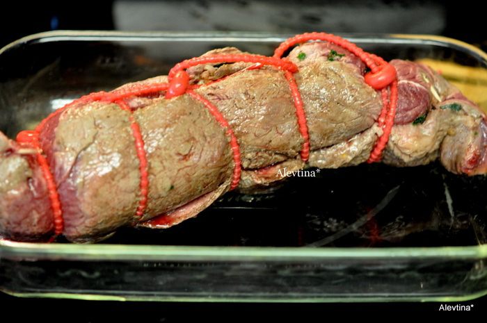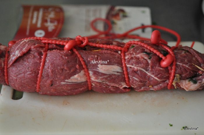 Используем кулинарную нить от Ю.Высоцкой, например, или др. приспособления, начиная с одного конца и заканчивая вторым. Если нужно можно прихватить концы зубочистками.