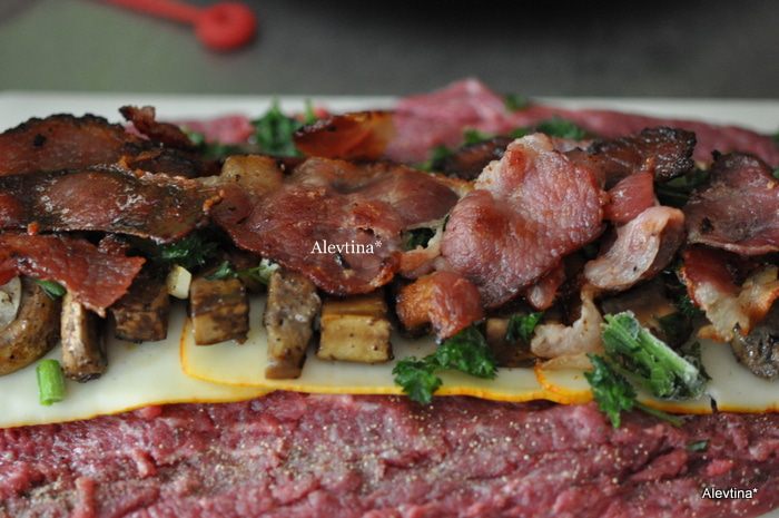 Говядину слегка посолить и поперчить, выложить в центр пласты сыра. Затем обжаренные грибы, зелень, Сверху кусочки бекона.