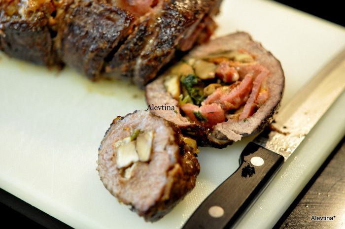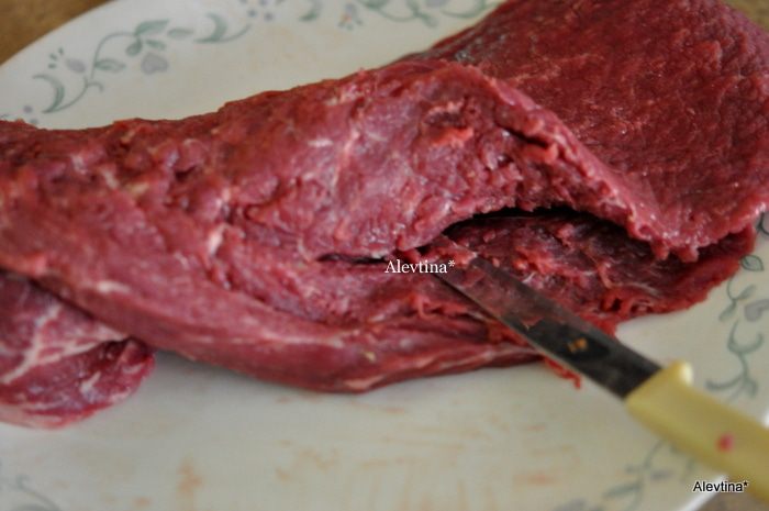 Разрезать говядину бабочкой не до конца. Если толщина большая, то отбить молоточком.