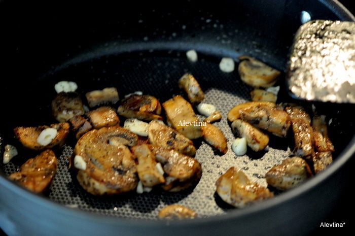Затем обжарить на оливковом масле 2 стол.л грибы порезанные минут 10. Добавить чеснок порезанный, соль и перец по вкусу. Обжаривать 2 мин.снять с огня.