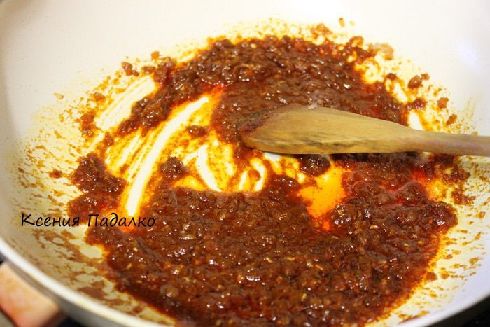 Затем добавить паприку и интенсивно перемешать, пока паприка не впитает все масло.