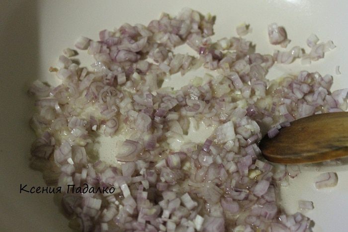 Лук нарезать мелкими кубиками. Добавить в сковороду масло и обжарить лук до слегка золотистого цвета.