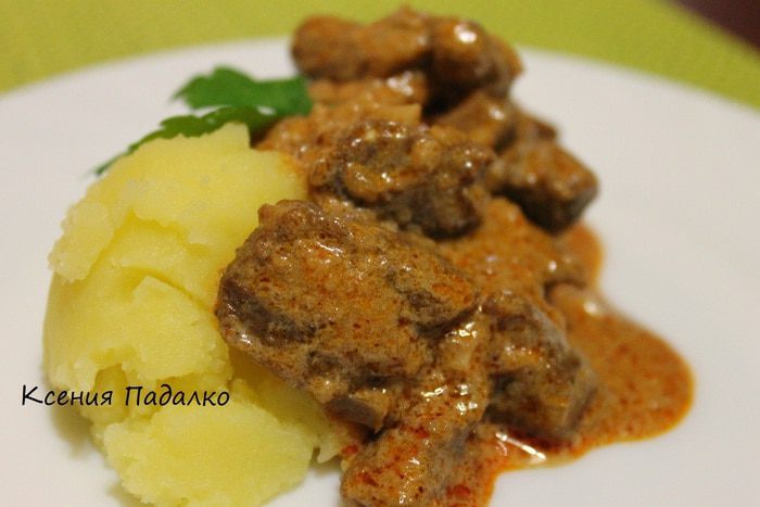 За 10 минут до готовности добавить мелко рубленый чеснок и сметану. Еще немного протушить все вместе и выключить огонь. Подавать с любимым гарниром. Приятного аппетита!!!