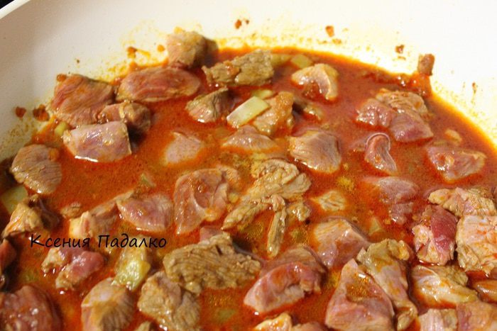 Потом добавляем воду. Убавляем огонь, накрываем крышкой и тушим до готовности мяса. (мне понадобился час).