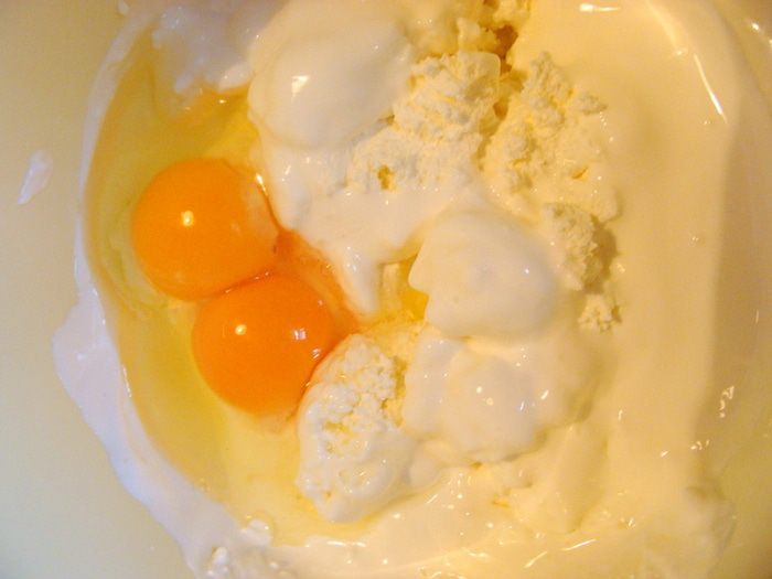 Творог, сметану и яйца взбить миксером.