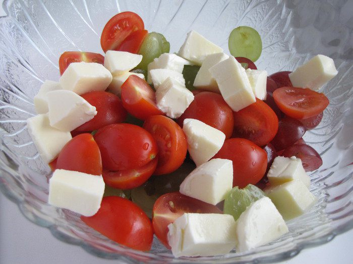 Добавить помидоры черри, разрезанные пополам, и шарики мини-моцареллы.