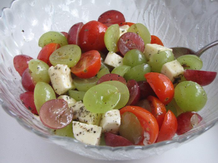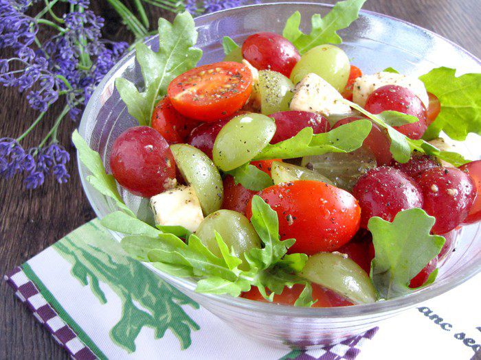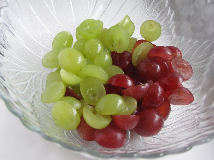 Темный и светлый виноград лучше взять без косточек. Если виноград с косточками, то разрезать пополам и удалить косточки. Выложить в салатник.