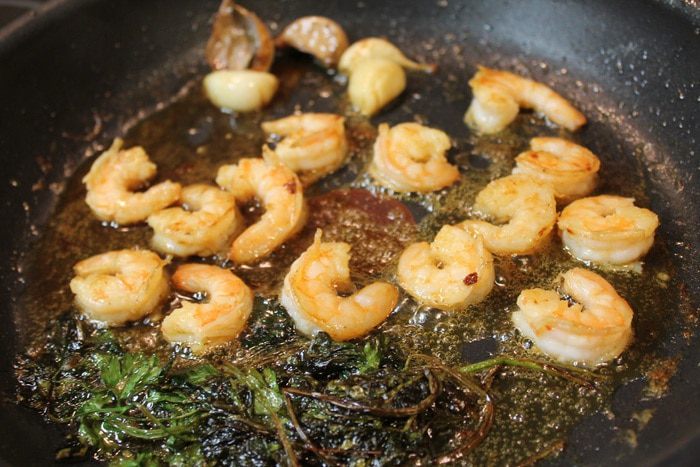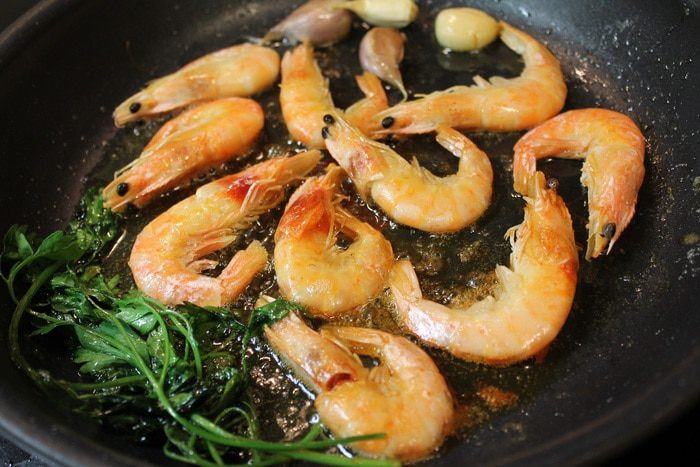 Добавляем петрушку (не резанную) и раздавленные зубчики чеснока. Готовим 2-3 минуты, пока чеснок не даст аромат. После этого добавляем мытые креветки.
