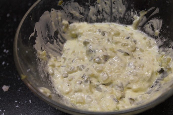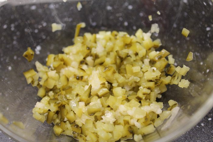 Теперь готовим соус. Очень мелко нарезаем маринованный огурец и смешиваем с измельченным чесноком.
