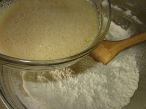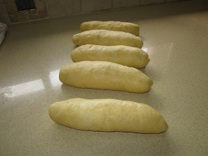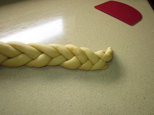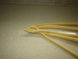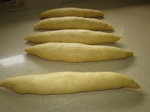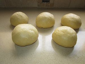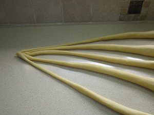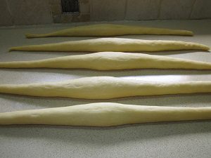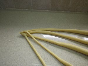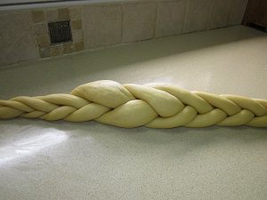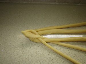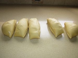 Халу традиционно плетут в форме косички. Говорят, что так задумал влюбленный польский пекарь, который (видимо справедливо) считал, что красивее косы его любимой девушки ничего в природе и быть не может и посему и этому праздничному хлебу придал именно эту форму. Плести эту косу можно и из трех, и их четырех, пяти и шести жгутиков. Вот тут четких канонов нет... да и на вкусе, Вы ж понимаете, это не сказывается... Так уж будьте любезны, выбирайте, творите, фантазируйте! У меня тоже есть свое любимое плетение... Именно оно идеально соответствует моему представлению о прекрасном. Оно очень простое, из 5 жгутов и выигрышно объемное. Рекомендую. Подошедшее тесто делим соответственно на 5 равных частей.