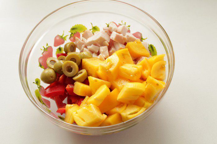 Добавить порезанный лук, оливки и помидоры кубиками..