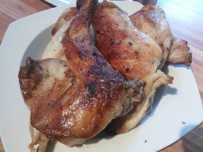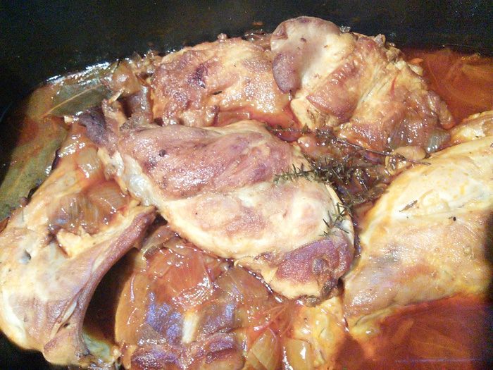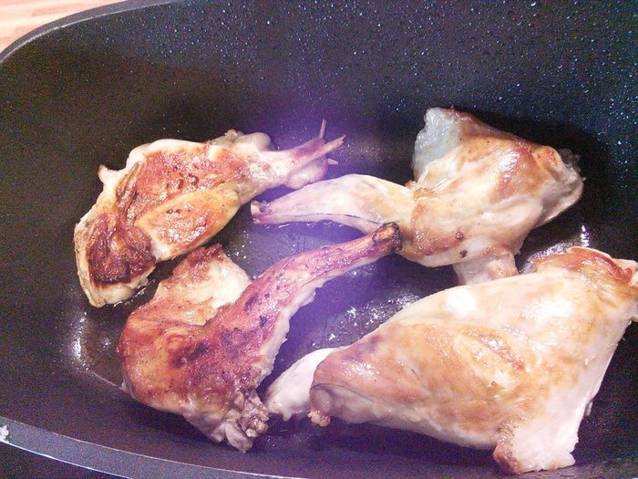 В жаропрочной кастрюле разогрейте масло, обжарьте части кролика со всех сторон до золотистого цвета. Затем выложите мясо на тарелку.