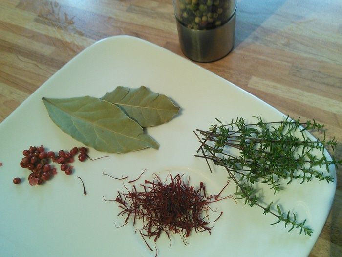 Добавьте специи, шафрана в порошке у меня не оказалось, поэтому я добавила щепотку шафрановых нитей, предварительно заварив их в небольшом количестве горячей воды.