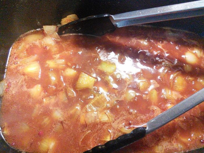 Переложите мясо в кастрюлю вместе с соком, от него образовавшимся, накройте крышкой или фольгой.