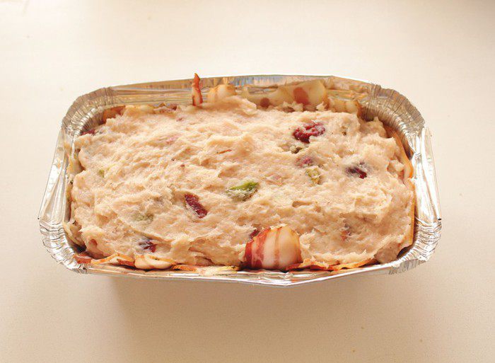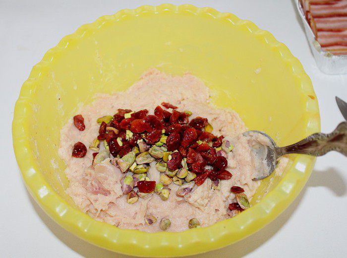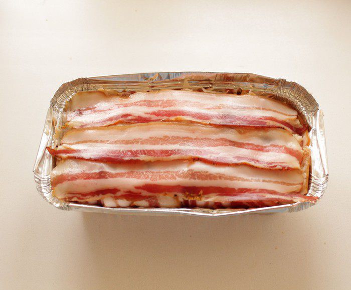 Форму для кекса выстелите полосками бекона внахлест, от середины к краям. Выложите поверх полосок бекона массу для террина, хорошенько спрессуйте ее,