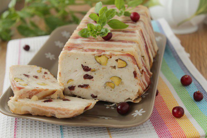 Террин оказался нежным, аппетитным, с приятными контрастными вкраплениями слегка похрустывающих фисташек и вяленой клюквы, предварительно томленой в коньяке. Он не только вкусен, но и невероятно красив, он украсит ваш стол и в будни и в праздники.