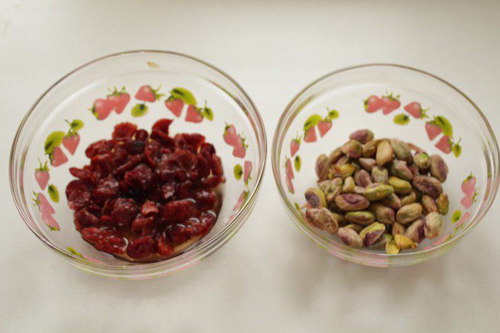 Пюрируйте все блендером , добавьте клюкву вместе с коньяком. фисташки, все перемешайте.