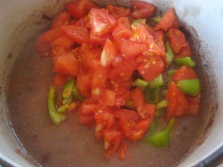 Когда фасоль приготовится, добавить нарезанные томаты и перец к фасоли.