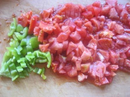 Перец и помидоры вымыть. С помидоров снять шкурку, опустив овощи в горячую воду, на полминутки. Мелко нарезать.