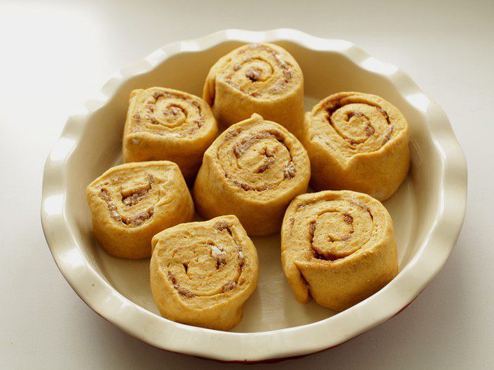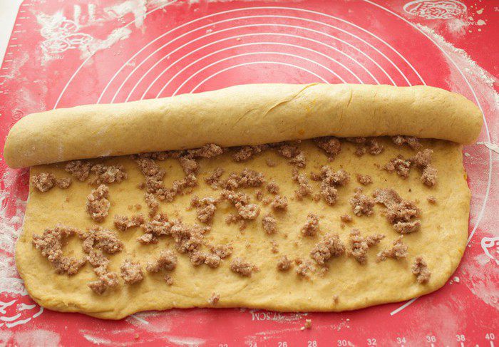 Когда тесто подошло, раскатать его в прямоугольник толщиной около 1 см.