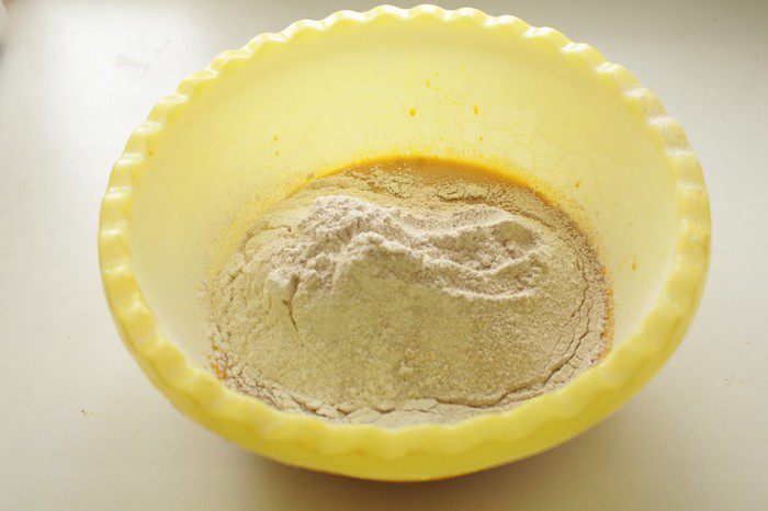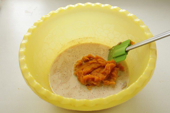 Развести в теплом молоке дрожжи, мед, добавить тыквенное пюре.