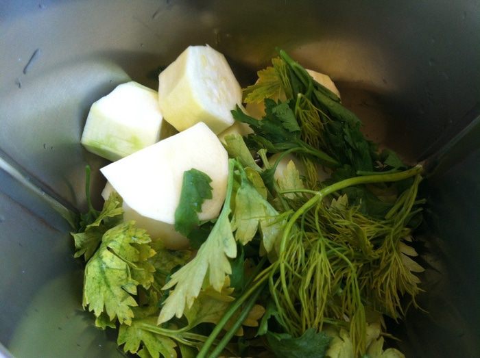 Почистите кабачок и чеснок, зелень промойте и обсушите бумажным полотенцем, измельчите блендером и добавьте в фарш.