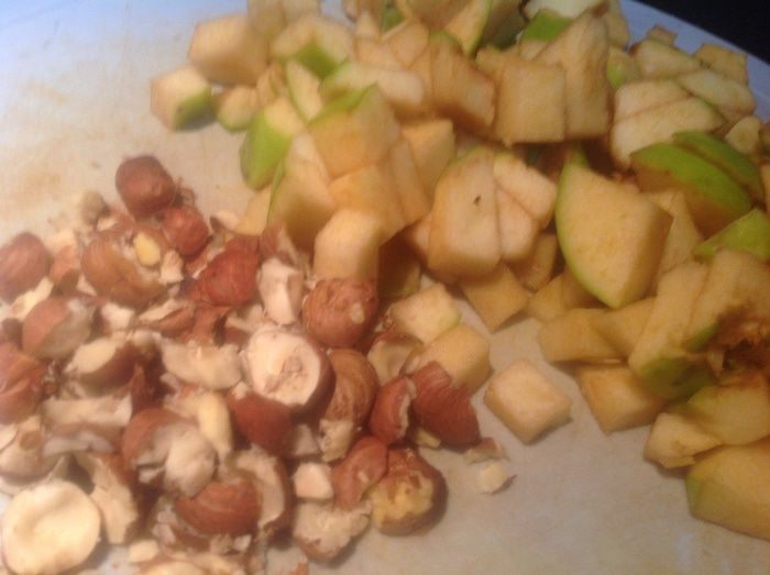 Разогрейте духовку до 170 градусов. Из яблок удалите сердцевину, и мелко порежьте. Фундук порубите.