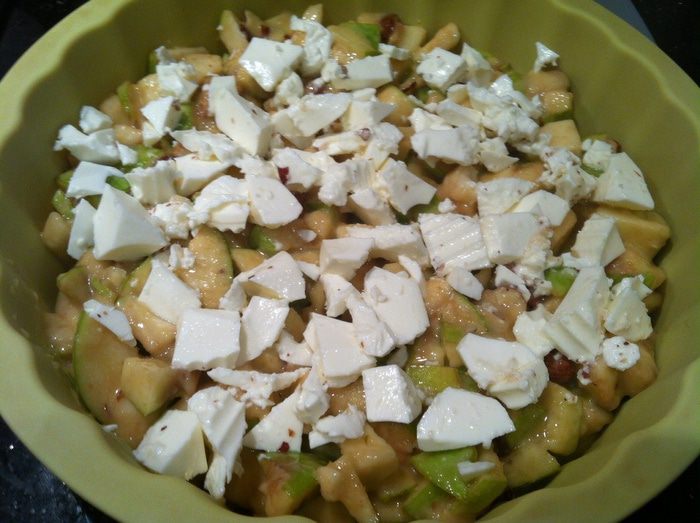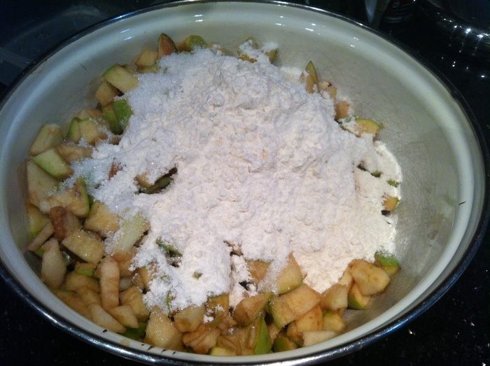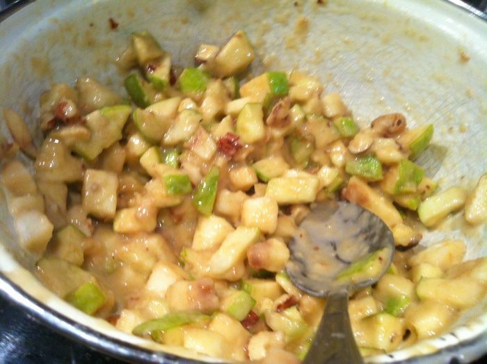 Смешайте яблоки, сахар, муку, соль, разрыхлитель и фундук.